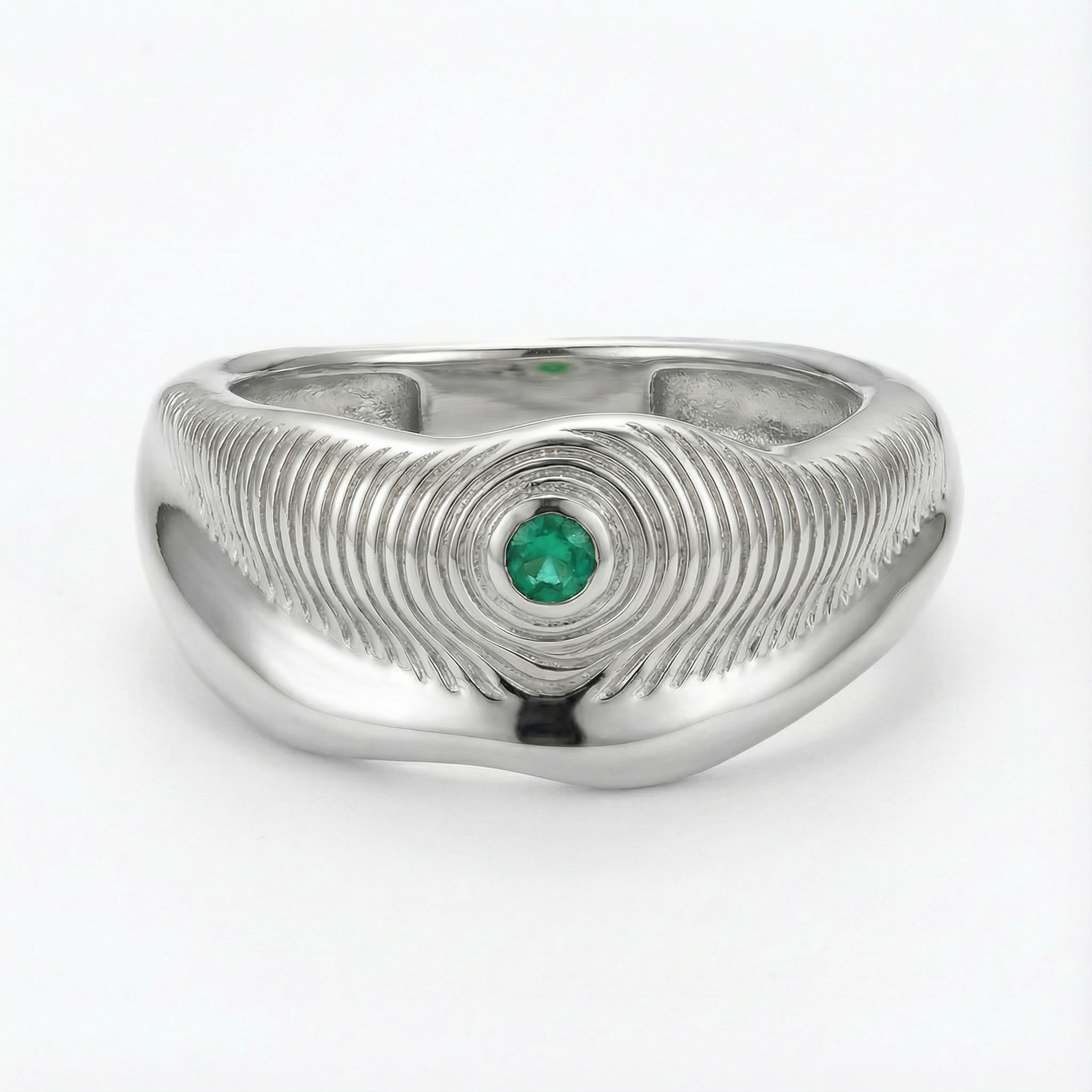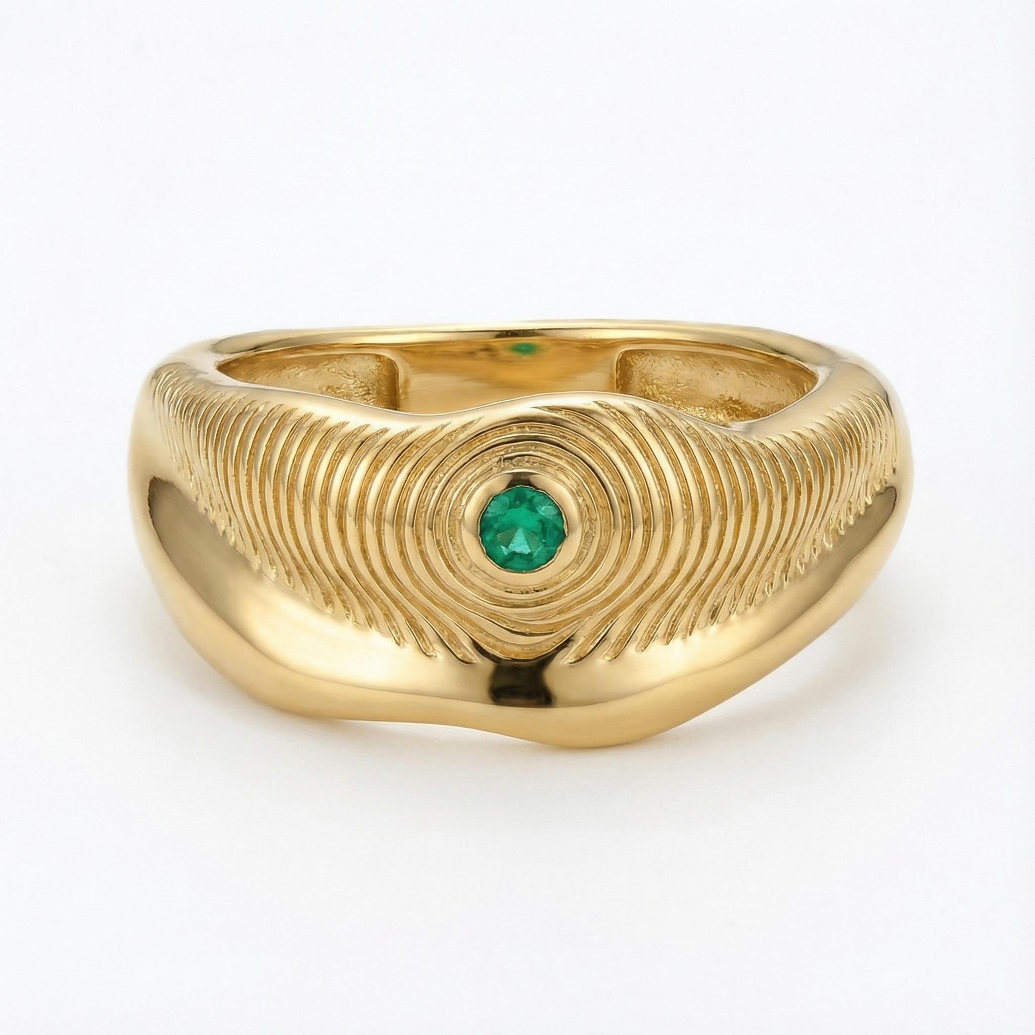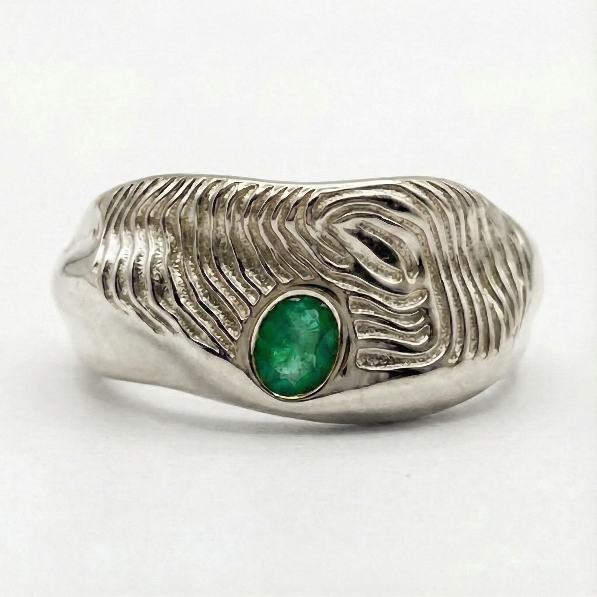Nestled within flowing forms, the emerald glows against surfaces of gold and silver, two metals chosen to symbolize the contrast between past and present, light and dark.